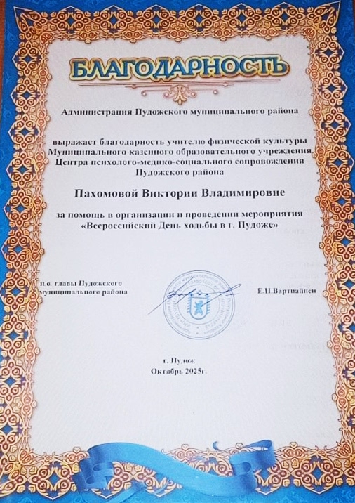 Учителю физической культуры Виктории Владимировне Пахомовой вручено Благодарственное письмо Администрации Пудожского муниципального района за помощь в организации и проведении мероприятия.