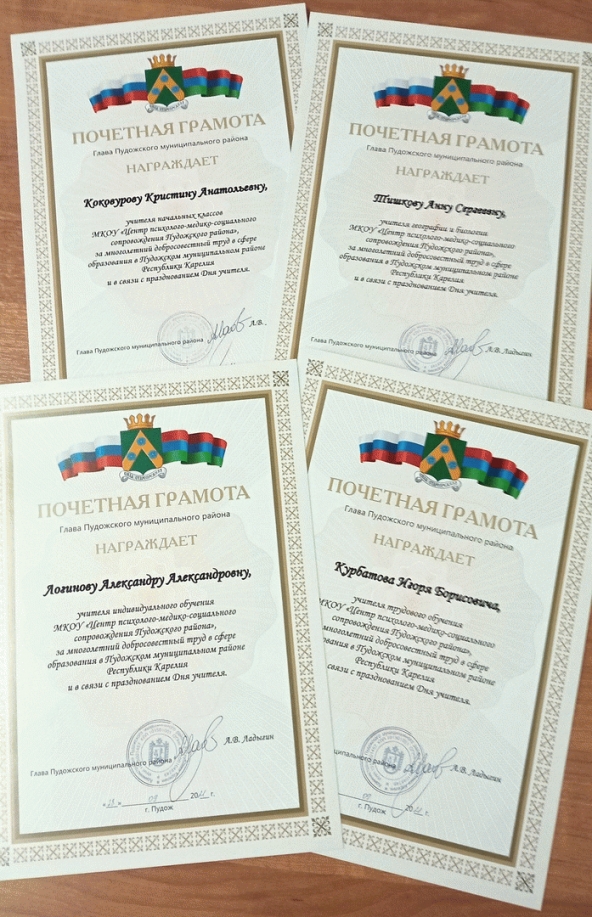 За многолетний добросовестный труд в сфере образования Пудожского муниципального района, личный вклад в обучение и развитие детей с ограниченными возможностями здоровья, достижение высоких результатов работы Почетными Грамотами Главы Администрации Пудожского муниципального района награждены педагоги МКОУ Центра ПМСС Пудожского района: