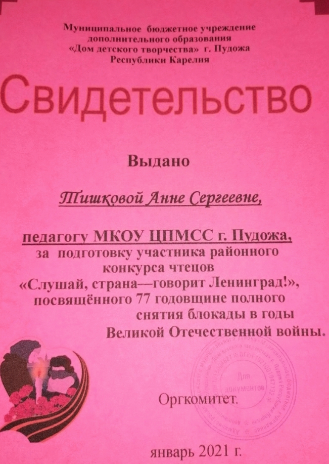Педагогу вручено свидетельство за подготовку участника в районном конкурсе.