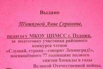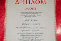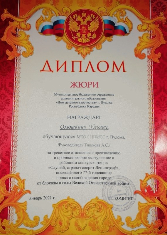 За трепетное отношение к произведению и проникновенное выступление в районном конкурсе чтецов Ульяна награждена Дипломом.