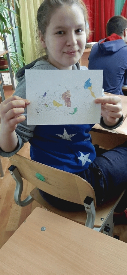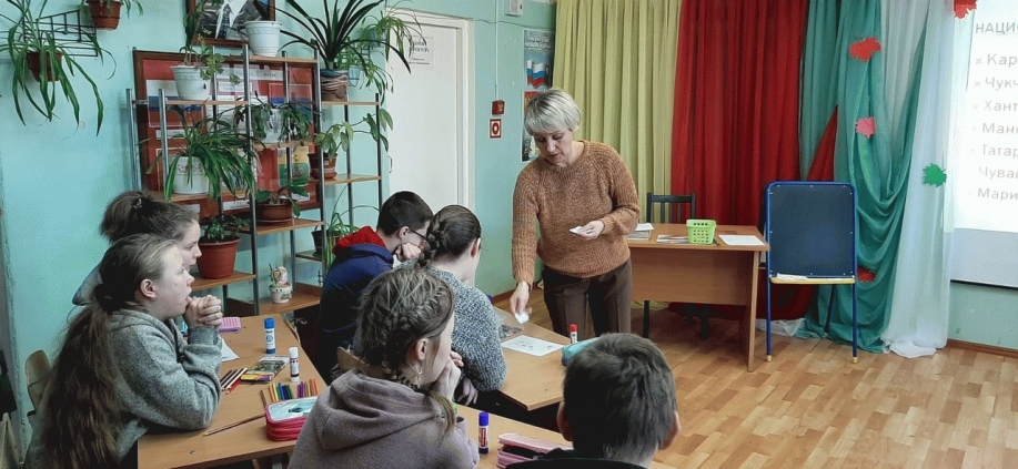 Урок начался торжественно – прозвучал гимн РФ. В ходе мероприятия обучающиеся знакомились с национальными костюмами, ремеслами, кухней малых народов России. Интересными и полезными были работа с картой, разрезными картинками и словами. Игровой момент – состязание команд в игре «Палка» - запомнился всем присутствующим своим азартом и соревновательным духом. На протяжении всего занятия звучали народные песни. В завершение урока обучающиеся раскрасили национальные костюмы и обобщили полученные знания.