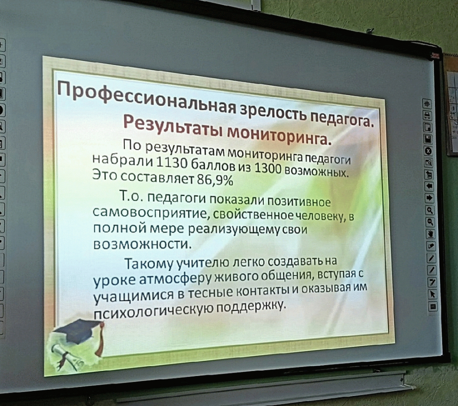 Информация была очень интересной и полезной! С педагогами проведена методика «Психологический портрет учителя» с целью самодиагностики психологических причин профессиональных затруднений. По результатам анализа проведенного мониторинга был составлен психологический портрет педагога и всего нашего коллектива в целом.