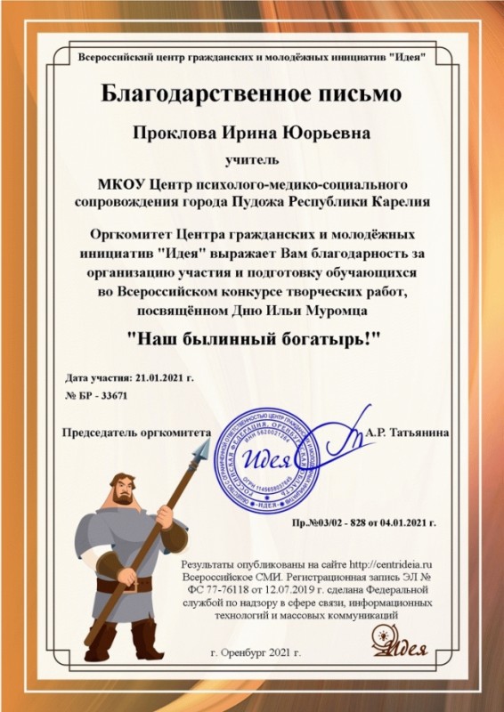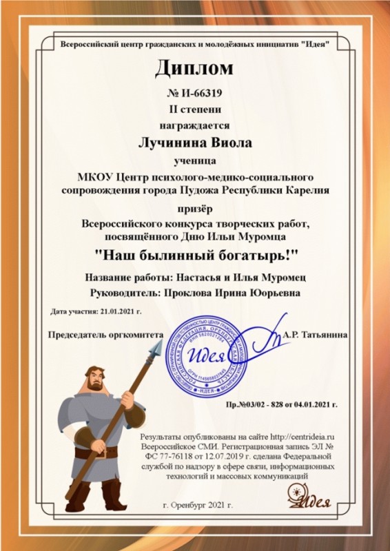 Во Всероссийском конкурсе творческих работ, посвящённом Дню Ильи Муромца "Наш былинный богатырь" приняла участие ученица 9 класса Виола Л. с работой