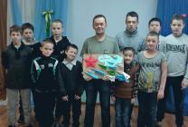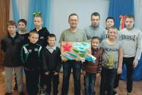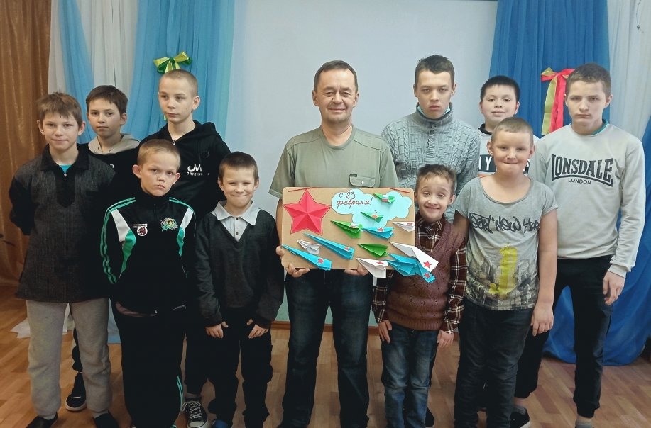 На занятиях по дополнительному образованию в МКОУ Центре ПМСС (кружках «Творческая затейная» и «Берегиня») под руководством педагогов Дома детского Творчества г.Пудожа Надежды Алексеевна Дьяконовой и Светланы Николаевны Точиновой в предверии праздника 23 февраля мальчишки приготовили подарок своему учителю трудового обучения Игорю Борисовичу Курбатову.