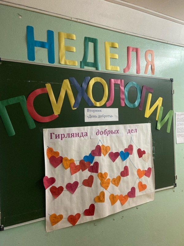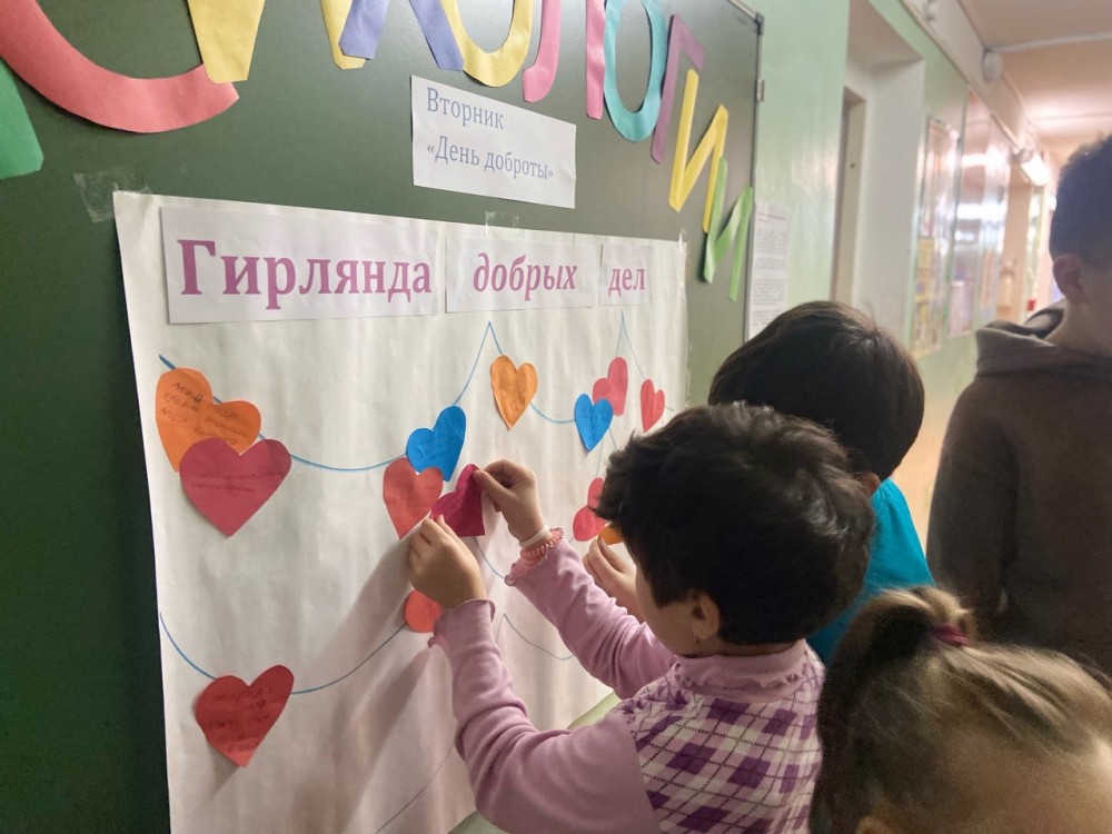В течение всего лишь одного дня ребята делают немало доброго: кому-то помогают делом, кого-то поддерживают, кому-то говорят добрые и ласковые слова. По результатам дня была проведена акция «Гирлянда добрых дел». Каждый из детей прикрепил в виде гирлянды сообщение о том, какое доброе дело удалось сделать в течении дня. Записи велись на специальных разноцветных сердечках. В результате появилась целая гирлянда добрых дел. Дети оценили, насколько значимы их собственные достижения, осознали, как важно оказывать помощь родным и близким. Все ученики проявили себя как добрые и отзывчивые дети!