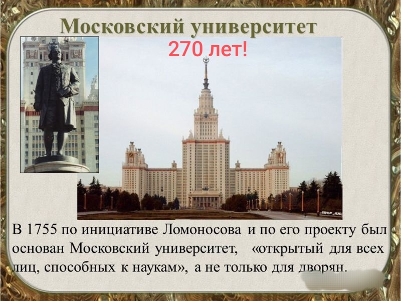 25 января 1755 года состоялось открытие Московского государственного университета (сокр. МГУ).