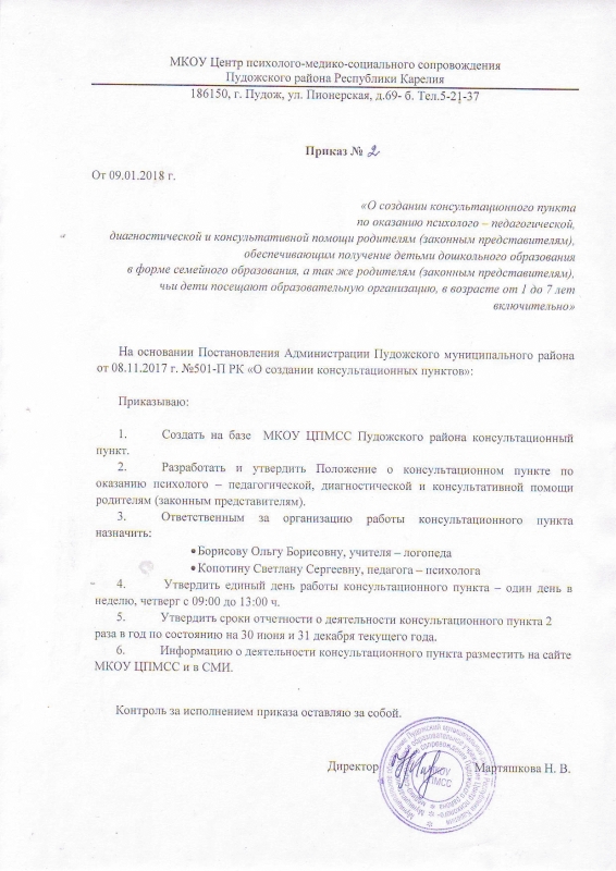 3.Приказ о создании Консультационного пункта на базе МКОУ ЦПМСС от 09.01.2018 г